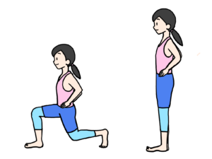 片足を前に出して腰を落とす動きで、腸腰筋をしっかり伸ばすことができます。デスクワークで固まりやすい筋肉をゆるめるのに効果的です。